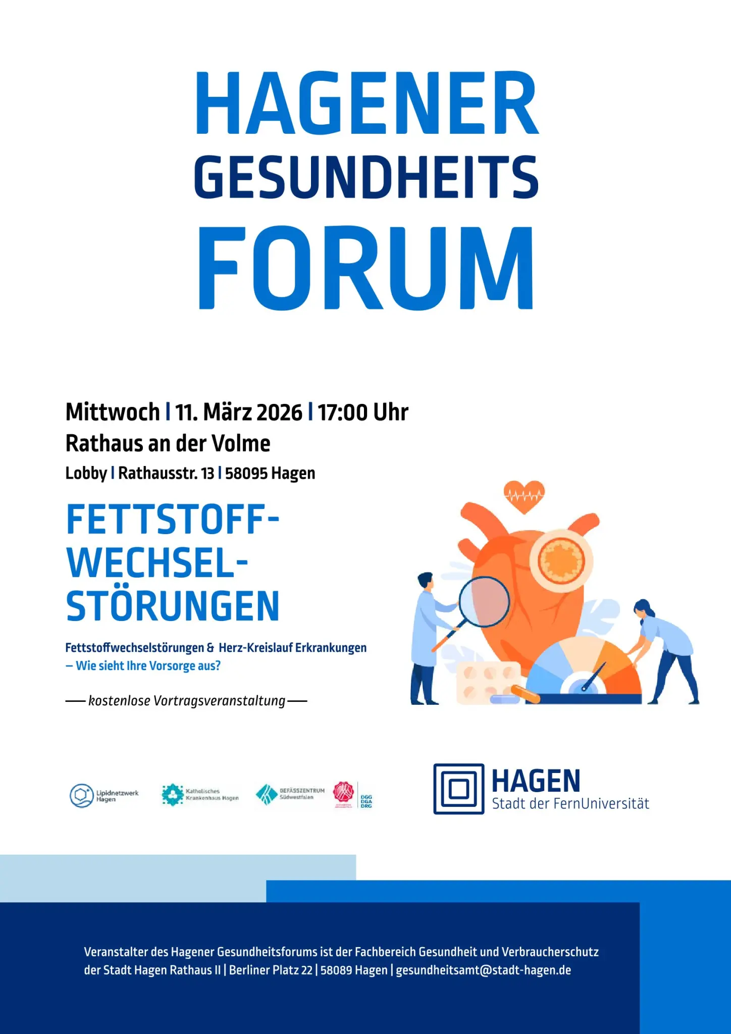 Am 11. März 2026 um 17.00 Uhr bis 19.15 Uhr informiert das Hagener Gesundheitsforum im Rathaus an der Volme (Lobby, Rathausstr. 13, 58095 Hagen) zu dem Thema "Fettstoffwechselstörungen & Herz- Kreislauferkrankungen - Wie sieht Ihre Vorsorge aus?"