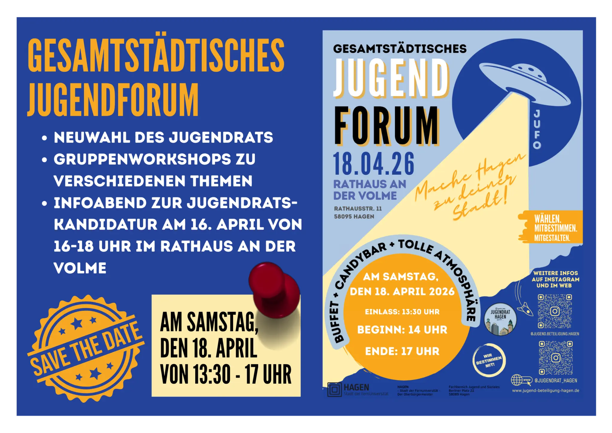 Mittwoch, 25.März 2026Hagen gemeinsam für junge Menschen gestalten: Mit diesem Ziel findet am Samstag, 18. April, von 13.30 bis 17 Uhr das diesjährige gesamtstädtische Jugendforum mit der Neuwahl des gesamtstädtischen Jugendrats der Stadt Hagen im Ratssaal im Rathaus an der Volme, Rathausstraße 13, statt. Eingeladen sind alle Jugendlichen aus Hagen, um sich über aktuelle Themen, Bedarfe und Ideen auszutauschen.
